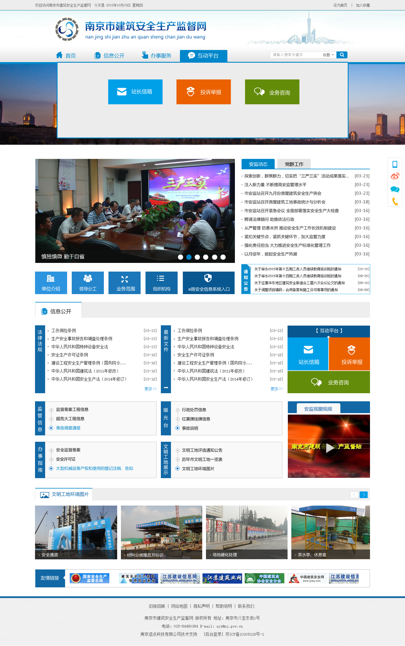 南京市建筑安全生產(chǎn)監(jiān)督站于1992年9月成立,是承擔全市建筑安全生產(chǎn)監(jiān)督與管理的事業(yè)單位。隸屬于南京市住房和城鄉(xiāng)建設委員會。負責主城區(qū)范圍內(nèi)市級(含)以上立項房屋建筑工程安全生產(chǎn)和文明施工的日常監(jiān)督管理。具體負責范圍內(nèi)施工現(xiàn)場監(jiān)督檢查、標準化工作管理推進、市級文明工地評比和省級(含)以上文明工地推薦,辦理安全監(jiān)督備案、安全生產(chǎn)許可證初審、起重機械設備登記備案等事項,參與生產(chǎn)安全事故調(diào)查,對各區(qū)監(jiān)督機構(gòu)進行業(yè)務指導。
